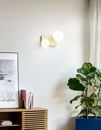 Penta è un'applique moderna e dallo stile minimalista con montatura in metallo e diffusori in vetro soffiato bianco acidato con fissaggio a vite. Finitura: oro spazzolato. Una proposta di design per illuminare e impreziosire zone di passaggio come corridoio e scale. Lampadine LED G9 4W 3000 K incluse.