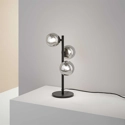 Lampada da tavolo moderna e di grande tendenza, Perlage ha una montatura in metallo con struttura lineare a sezione tonda. Finiture: nero opaco con vetri pirex fumè o ottone satinato con vetri bianchi acidati. Disponibile a una o tre luci. Lampadine LED G9 3W 3000 K incluse. Interruttore integrato.