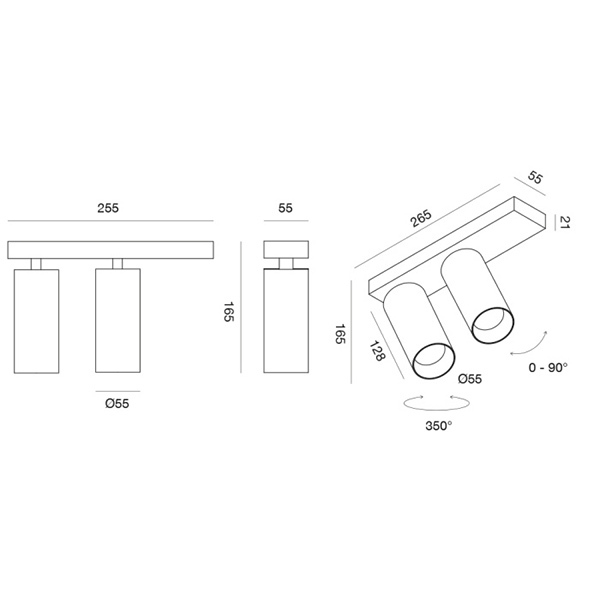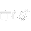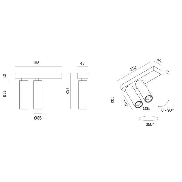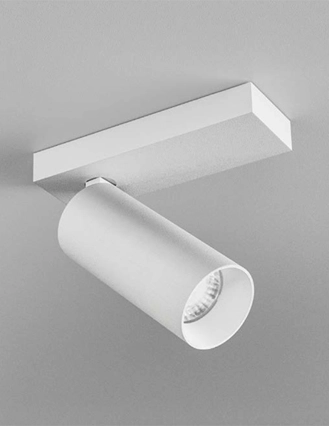 Plafoneria orientabile e funzionale con struttura in alluminio. Finitura in bianco satinato o nero satinato. Modulo LED e trasformatore inclusi. Si addice a forniture contract di esercizi commerciali o strutture ricettive.