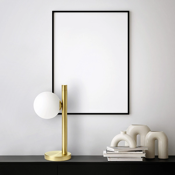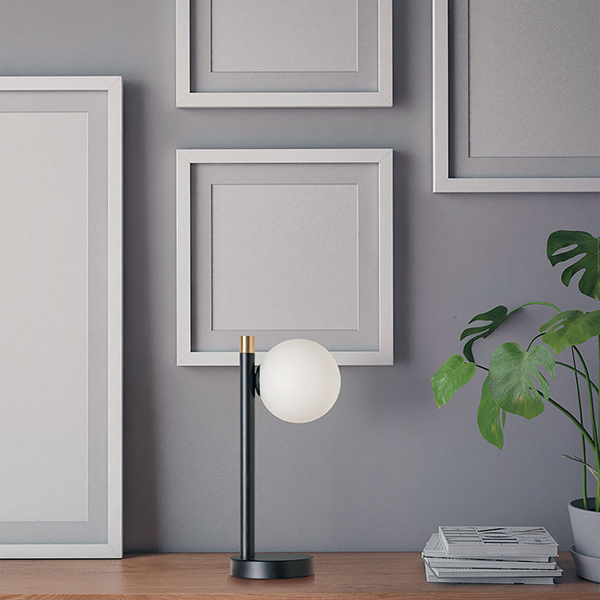 Lampada da tavolo versatile per ogni ambiente della casa. Lasciati accompagnare dalla luce di questa lampada elegante e di classe! Il diffusore è realizzato in vetro soffiato bianco latte con diametro di 10 cm. La montatura è verniciata in nero con particolare in ottone spazzolato. Il cavo di alimentazione trasparente dispone di un dimmer. Il design è di Marco Spatti.