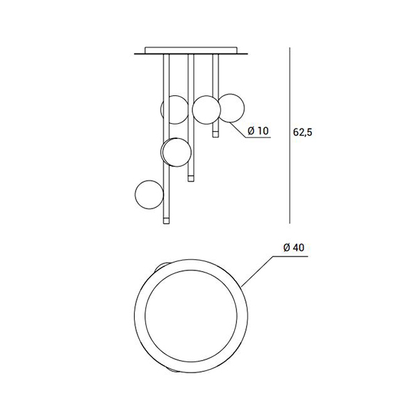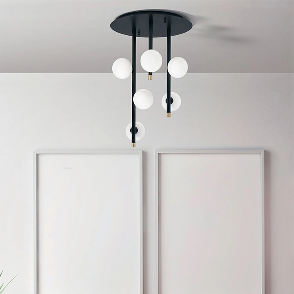 Plafoniera minimal ed elegante per illuminare l’arredamento della casa. I diffusori sono realizzati in vetro soffiato bianco latte con diametro di 10 cm. La montatura è verniciata in nero con particolare in ottone spazzolato. Il design è di Marco Spatti.