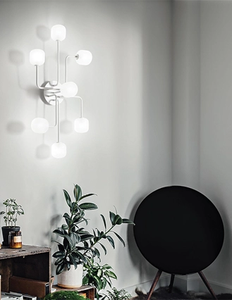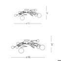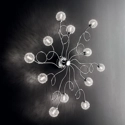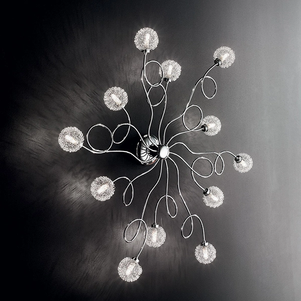 Plafoniera elegante e preziosa adatta alla zona living e alla zona notte della casa o a diversi ambienti di strutture ricettive. Pon Pon è disponibile in due versioni, a 8 o 12 luci. La montatura è in metallo cromato modellato artigianalmente. I diffusori hanno bolle di vetro soffiato avvolte da filamento in alluminio. Lampadina inclusa.