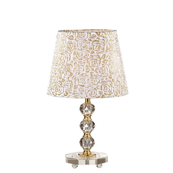 La montatura è in metallo dorato con elementi decorativi e base in cristallo molato, il paralume è in lamina di PVC rivestita in tessuto con decorazione trapuntata e brillantini dorati.