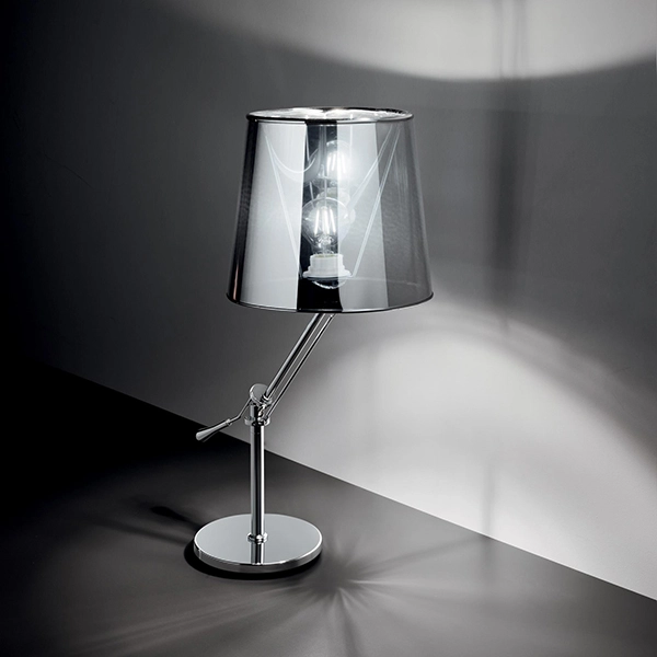 Lampada da tavolo con montatura snodata in metallo disponibile con finitura nickel satinato e paralume rivestito in tessuto bianco o con finitura cromo e paralume in PVC cromato. Il diffusore è regolabile ad altezze diverse. Soluzione ideale da posizionare sopra il comodino o sulla scrivania nella camera da letto di abitazioni private o alberghi.