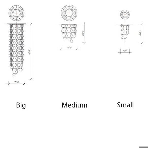 La struttura è in ferro verniciato bianco, gli anelli oltre alle varianti cromo e rame hanno altre finiture disponibili: oro e bronzo brunito lucido.