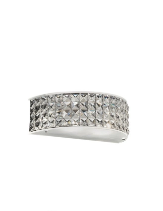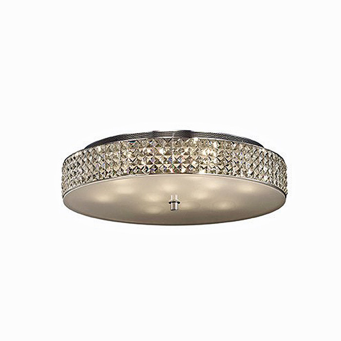 Montatura e dettagli in metallo cromato, diffusore con elementi quadrati in cristallo molato a mano sulla fascia laterale e vetro sabbiato sul fondo.
