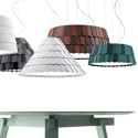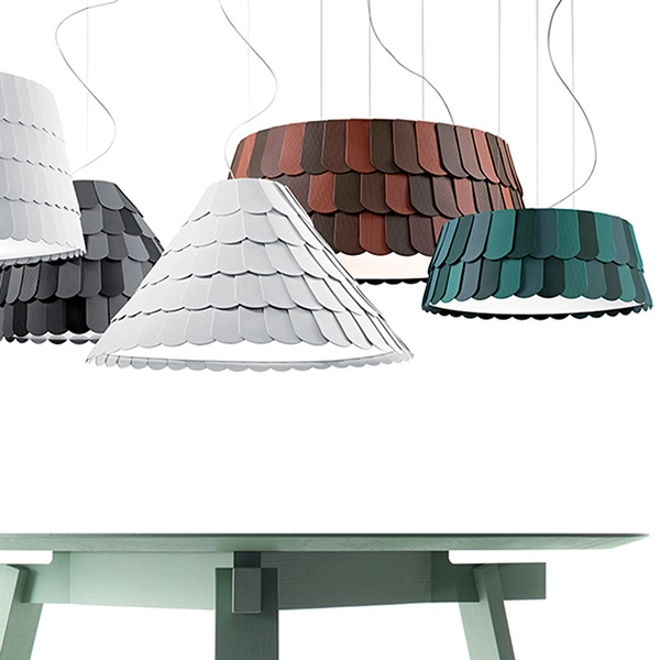 Roofer è un lampadario dalle forme, materiali e colori super contemporanei. Il  telaio è in metallo ricoperto da scaglie in materiale gommoso semi rigido disponibile in vari colori, ildiffusore in tessuto chiude la parte inferiore.