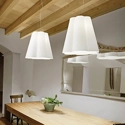 Serie di sospensioni con montatura in metallo cromato. Diffusore in vetro soffiato bianco e acidato. Cavi in acciaio a lunghezza regolabile con dispositivi ferma cavo automatici.