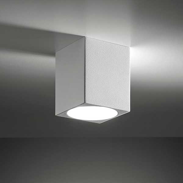 Plafoniera minimale in estruso di alluminio verniciato bianco opaco.