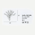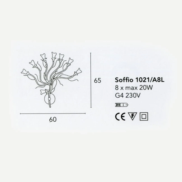 Applique 8 luci, realizzata da Bellart, struttura in metallo forgiato a mano e diffusori in vetro lavorati a manodecorati con murrine ambr.