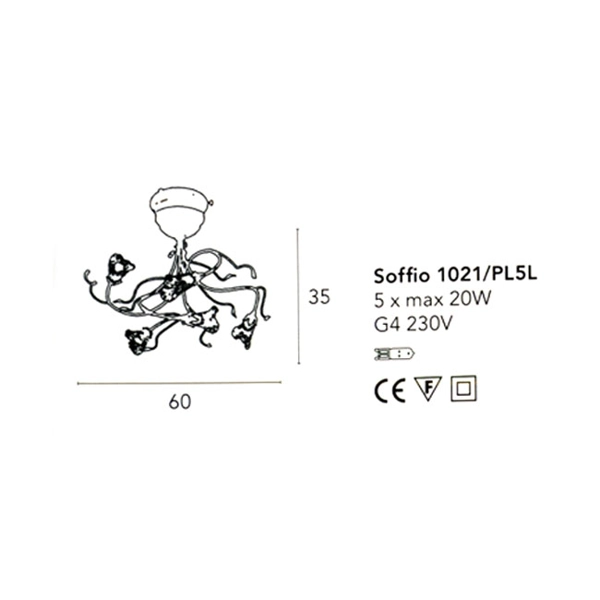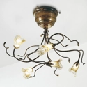 Plafoniera 5 luci, realizzata da Bellart, struttura in metallo forgiato a mano e diffusori in vetro lavorati a manodecorati con murrine ambra