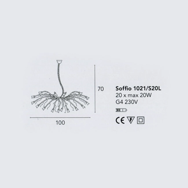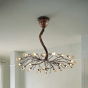 Sospensione 20 luci, realizzata da Bellart, struttura in metallo forgiato a mano e diffusori in vetro lavorati a manoe decorati con murrine ambra