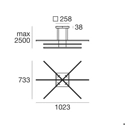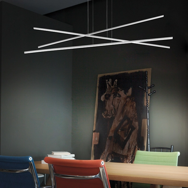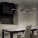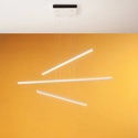 Lampadario scenografico e minimal perfetto per essere posizionato sopra il tavolo della cucina. Tre linee di luce ultrasottili combinabili liberamente a sospensione per un design semplice e elegante. La montatura è in alluminio verniciato bianco o nero raggrinzante, il diffusore è in policarbonato.