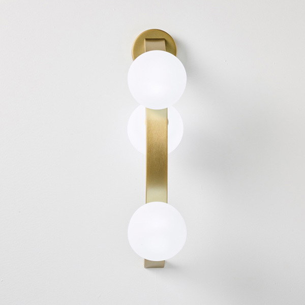 Applique di design in oro spazzolato per illuminare ambienti della casa, di hotel o negozi. Lampada da parete realizzata in alluminio con diffusori in vetro satinato. Sorgente luminosa: LED integrato. Dimmerabile.