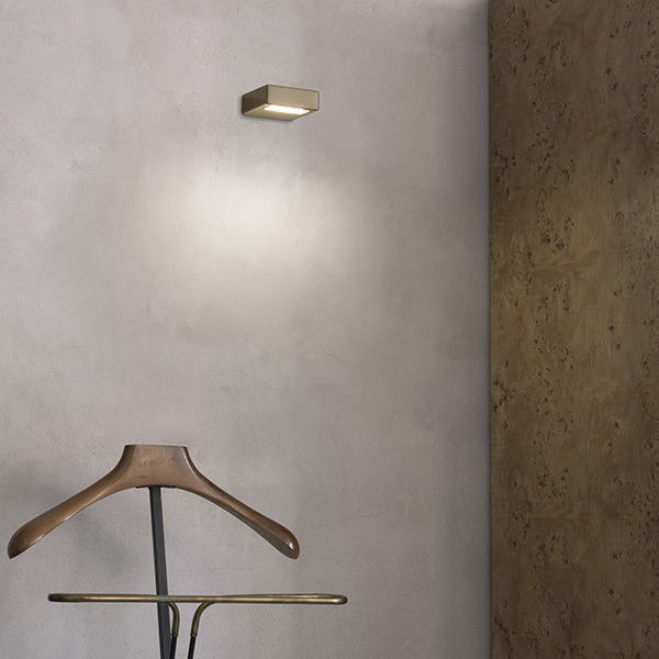 Applique moderna e di design con corpo luce in alluminio verniciato a polveri o placcato. Sorgente unica, protetta da diffusore in policarbonato trasparente. Colori: Bianco, Nero, Ottone.