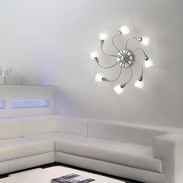 Tender è una plafoniera originale e dalla forma unica disponibile nelle versioni a 3 e 6 luci. La montatura è in cromo con bracci flessibili, i diffusori sono trasparenti in vetro pirex soffiato con parte interna smerigliata.