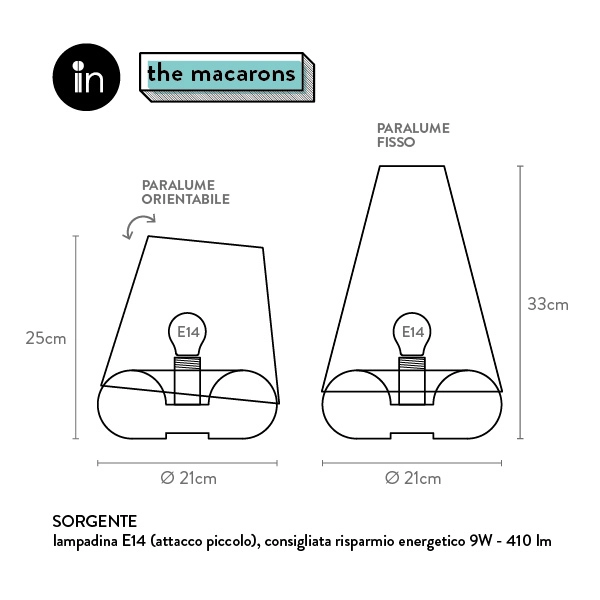 I paralumi più piccoli vestono la base inclinati come un basco, mentre gli altri poggiano perpendicolari sulla base.