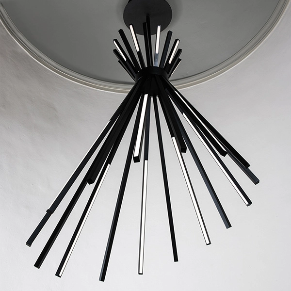 Lampada a sospensione a led composta da barrette luminose che possono essere ruotate a piacere. Tipi si caratterizza per una forma originale; la luce può essere posizionata all’interno o all’esterno della forma. Materiali: alluminio + acrilico. Grado di protezione IP20. Driver incluso.