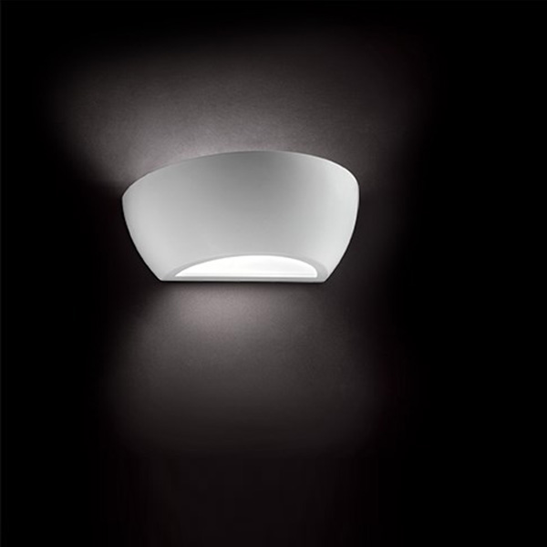 Il corpo luce è in gesso bianco, la base in metallo smaltato bianco e il diffusore inferiore è in vetro trasparente satinato.