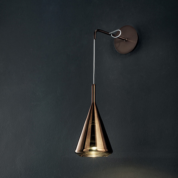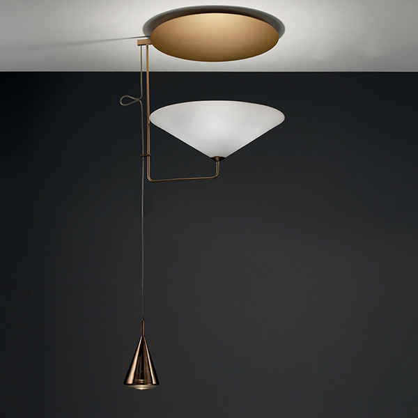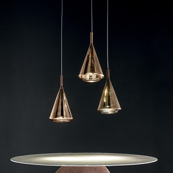 -La serie Kalì, che ricorda le forme stilizzate tipiche dell'art nouveau, nella versione sospensione singola (€438) e sospensione tre luci (€358)e nella versione applique (€182)