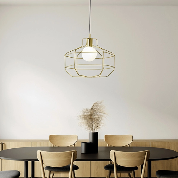 Wire è una lampada a sospensione che scende e illumina con stile tavoli di cucine e soggiorni moderni. Con un design unico come il suo, si presta anche ad installazioni in ambienti commerciali e ricettivi. Disponibile con struttura in tondino metallico in oro spazzolato e verniciato nero opaco. Diffusore interno in vetro opalino. Rosone in oro spazzolato e verniciato nero opaco. Cavo di alimentazione nero 200 cm. Lampadina installabile G9 a led.