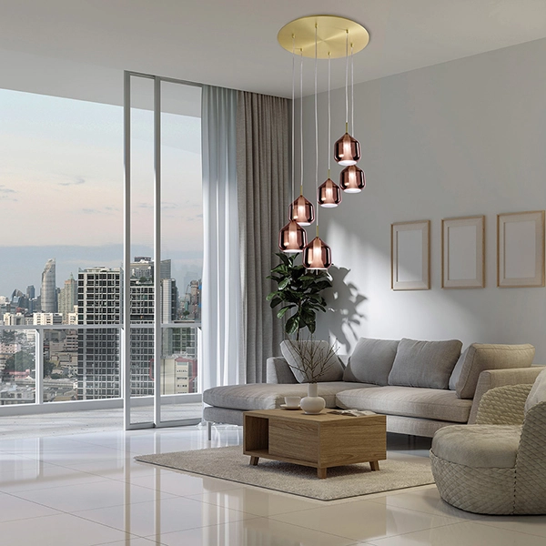 X-Ray nella versione a sospensione con 6 luci è una lampada che diventa oggetto di design per la zona living della casa. È realizzata in vetro borosilicato ed è un prodotto decisamente versatile grazie alla possibilità di configurare la sospensione con vetri di forme e colore diversi. Lo stelo e il rosone sono in oro spazzolato, mentre il cavo di alimentazione è trasparente ed è lungo 120 cm.